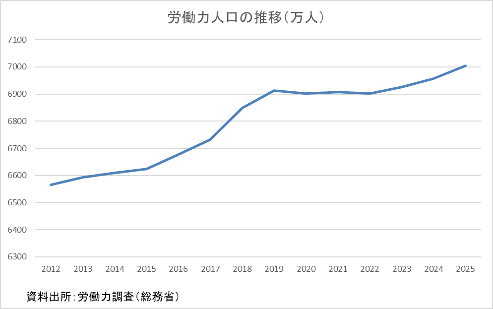 それでは、日本の労働力人口(15歳以上の就業者+完全失業者)は減っているのでしょうか。